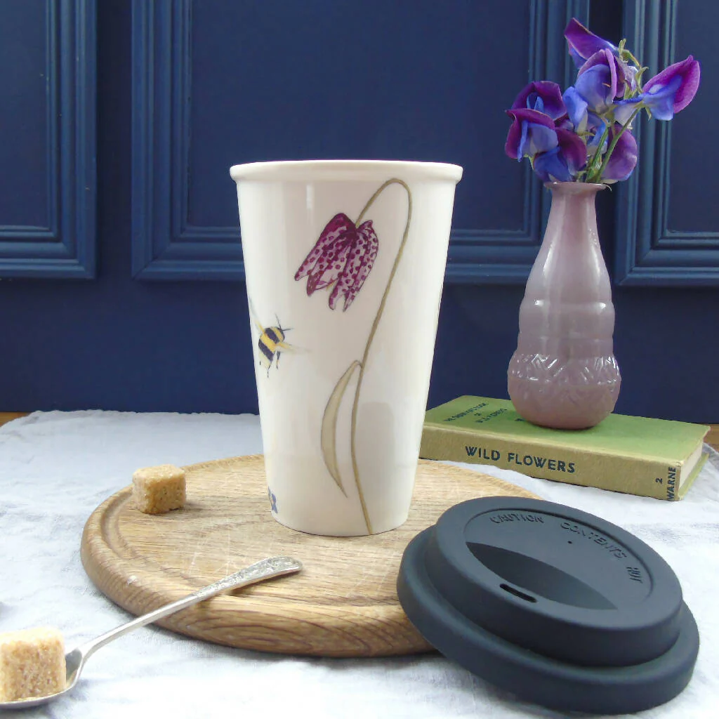 An elegant reusable mug featuring my watercolour paintings of spring flowers and bees. This bone china travel mug comes with a silicone sleeve and lid. Perfect to take into work without compromising on quality.Ā