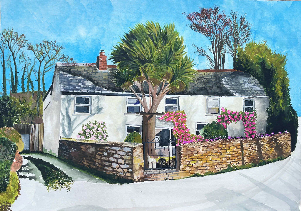 This stunning painting captures the beauty of a previous client's house, complete with charming flowers and lush trees.Â