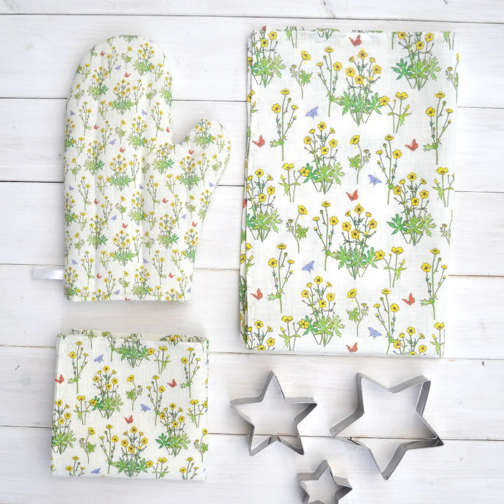 Pure Linen Tea Towel, featuring a hand drawn Buttercups design. Buttercups are a symbol of happiness and joy, and this tea towel will be sure to brighten up your home.