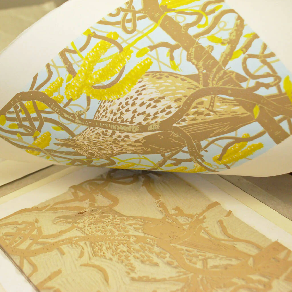 Catkin Song Thrush, hand-printed in 4 hand-blended inks.