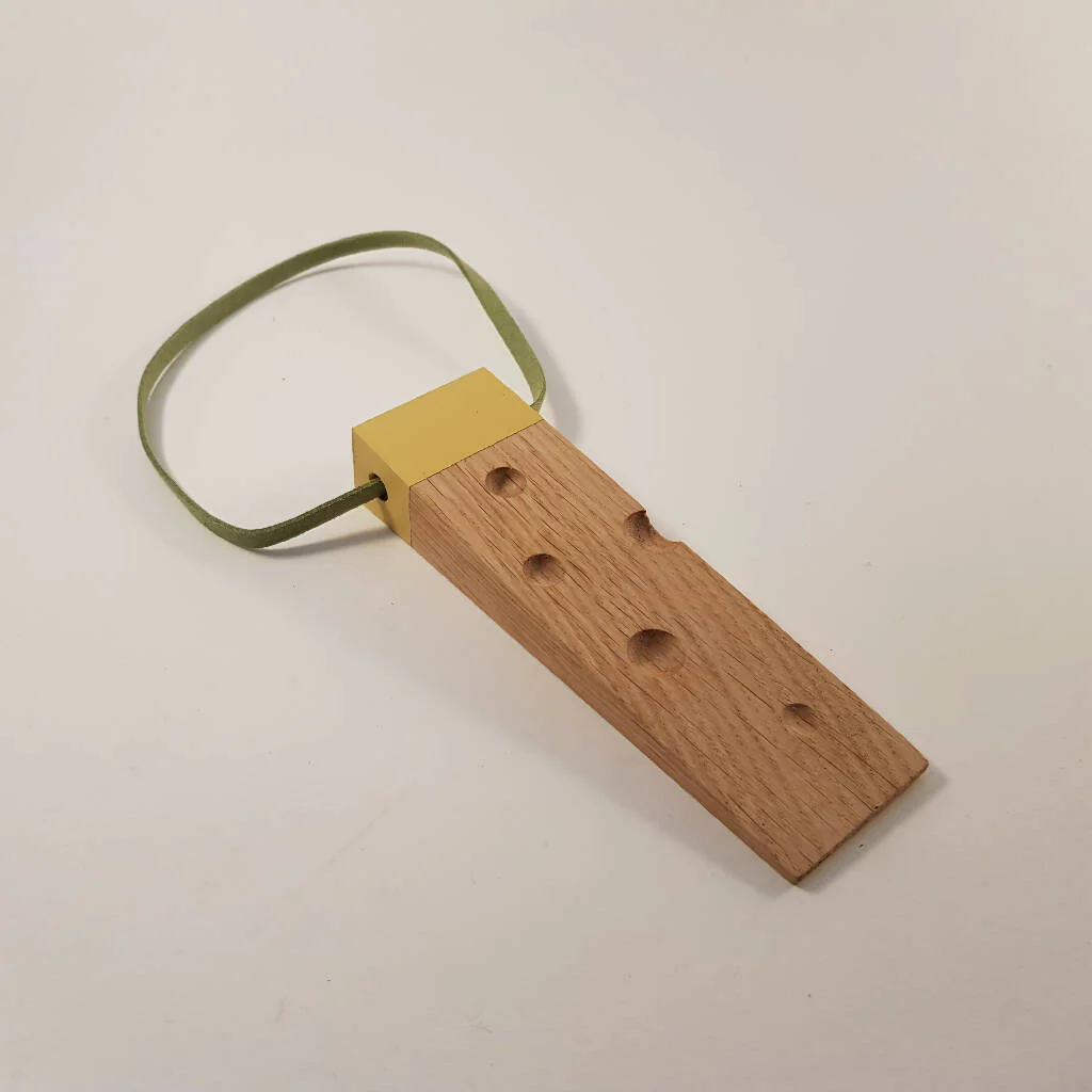 A funky door wedge made from hard wearing oak. Handcrafted with cheesy holes to add a little fun to wedging doors! Complete with a grey coloured leather strap. Finished with a splash of yellow and a couple of coats of Osmo top oil to add depth of colour and protection. Why not buy one of our unique small hooks to conveniently hang your wedge from?