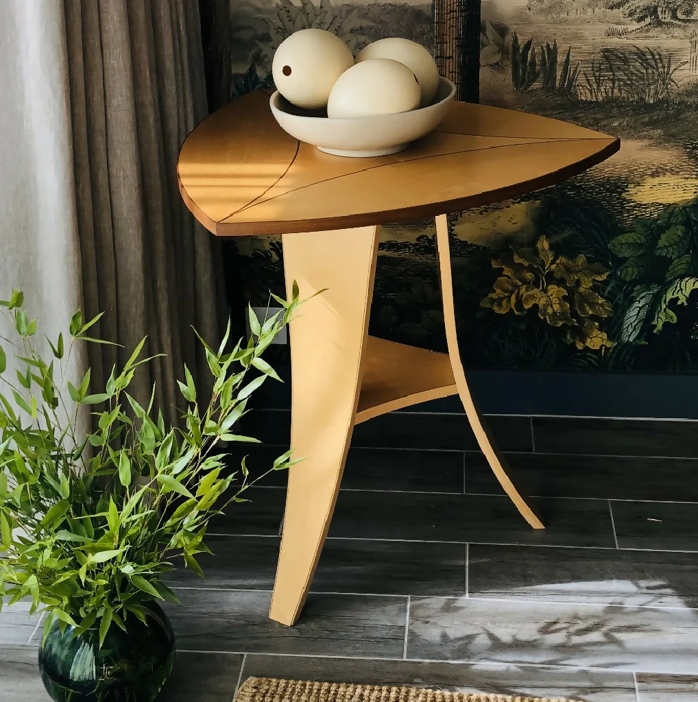 The subtle curves of the Ellipse table create an attractive first look. It is only when the beholder looks closer that they can begin to see the beautiful complexity of the design. When the pattern in the center of the table catches the light it comes to life and the beauty of the materials really comes out The craftsmanship can be seen through the hand cut marquetry throughout the table. Walnut has been used throughout the table to frame the table top and exaggerate each of the curves. Delivered by the maker.