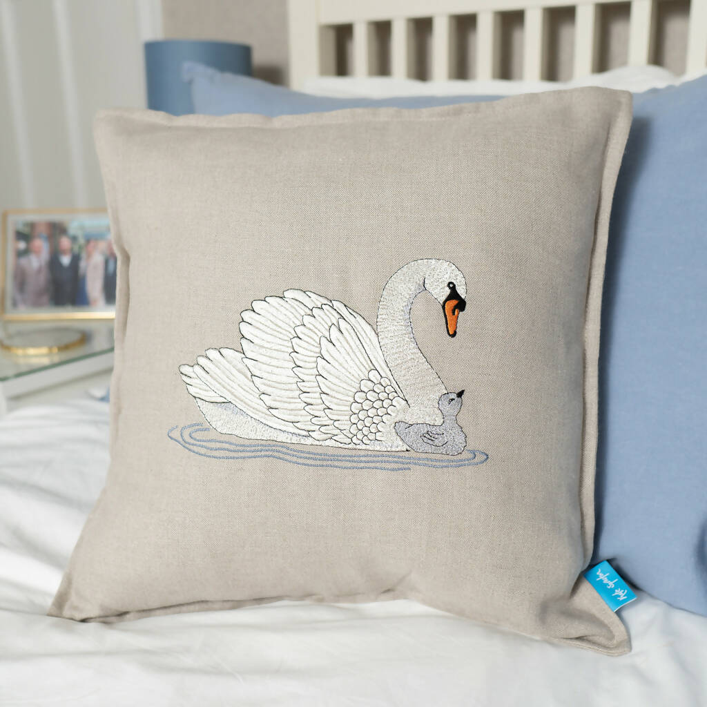 Beautifully embroidered with graceful swans, these exquisite cushions will add a luxurious finish to any home. Kate's original hand drawn designs have been artfully converted to stitch, and digitally embroidered with care and attention to detail. Spot the fluffy little cygnets nestled on their mother's back, whilst the male swan plumps up his plumage, to display each individual feather.
