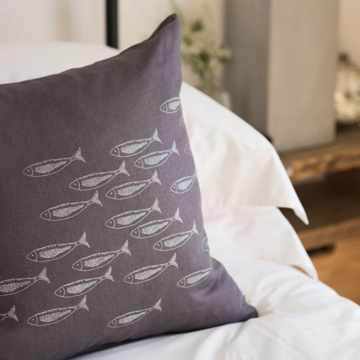 A beautiful cushion featuring a hand-printed design from our Quayside Collection in a lovely Cornish Slate Grey linen.Â