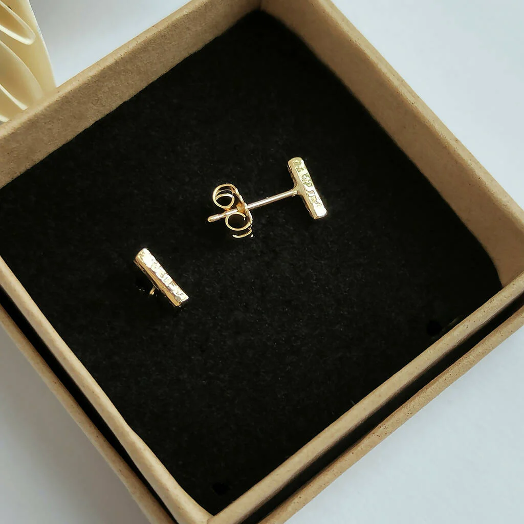 The delicate touch of 9ct Yellow Gold studs for your ears with these Hand textured "Bar" Earrings. No two are ever the same. A classic item for all occasions.