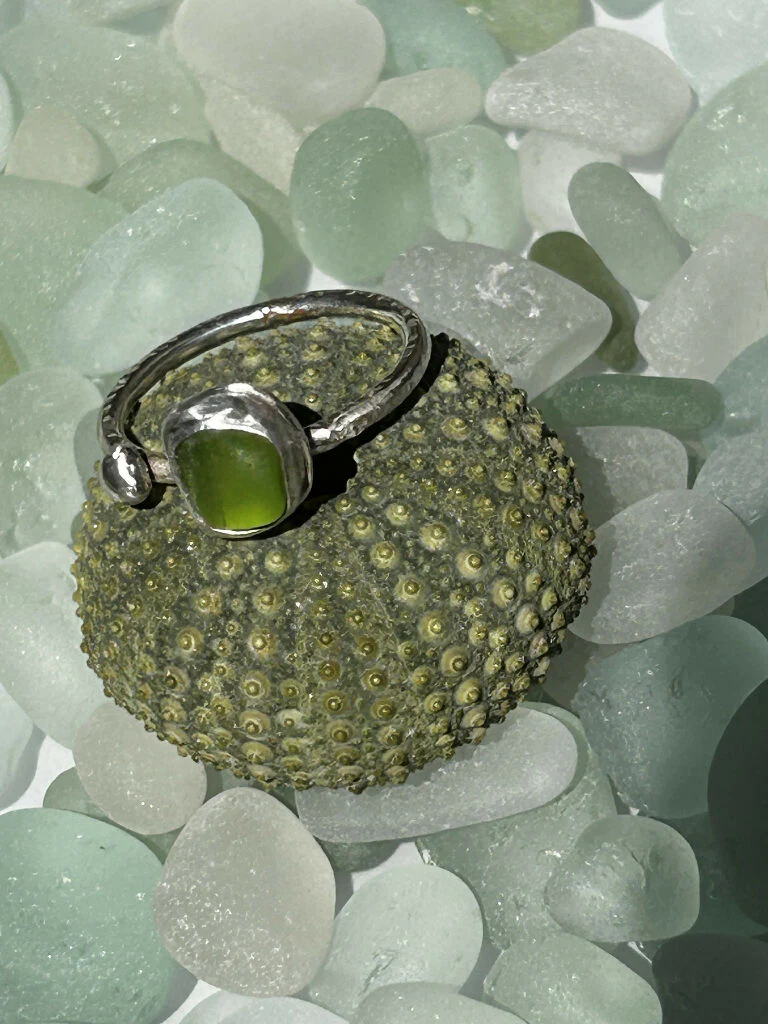 A piece of Dorset Seaglass set into a silver bezel setting on a sea shimmer water textured ring.