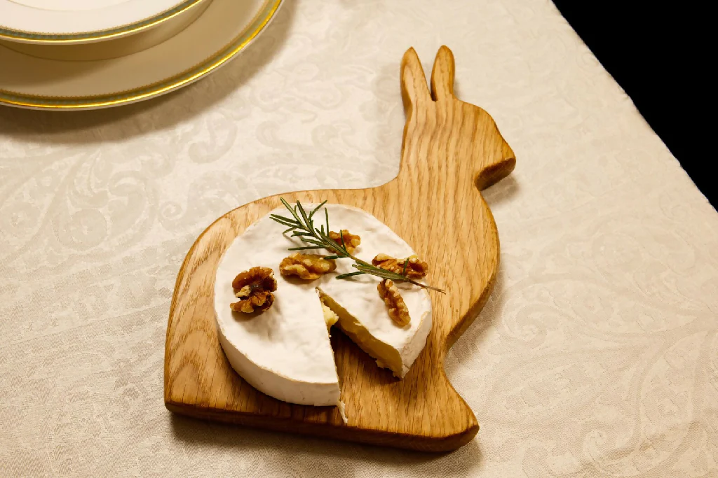 Made from sustainable hardwood and finished in food-safe chopping board oil. The natural grain patterns of the wood add a touch of rustic charm to your table, making each board a unique work of art. The sturdy construction ensures durability, making it a reliable companion for countless gatherings and celebrations. These large hand carved bunnies are made from Cherry or Oak in Somerset.