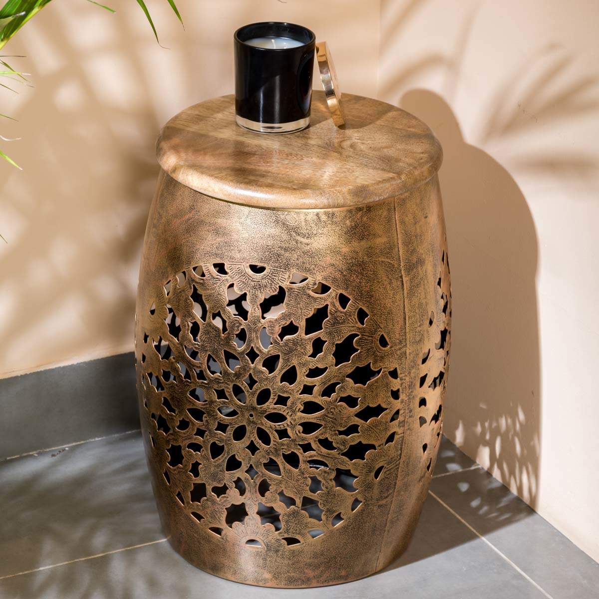 With an intricate pattern cut into the metal barrel shape base, these tables feature an intricate beautiful detail that will make them stand out.