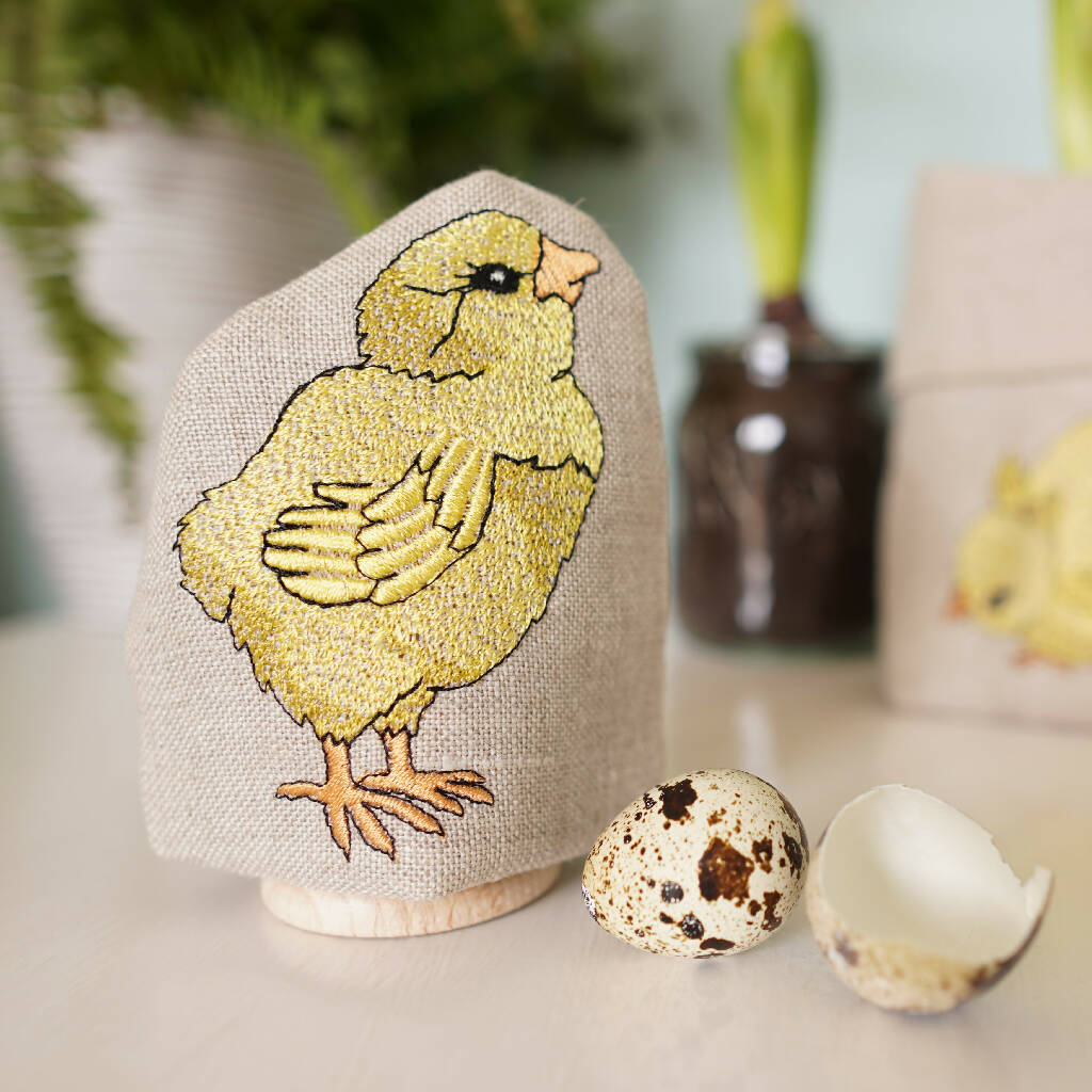 Made from 100% linen with cotton lining, each egg cosy is padded to keep your eggs extra warm, whilst each little chick is embroidered in satin thread. Recommended sponge clean.