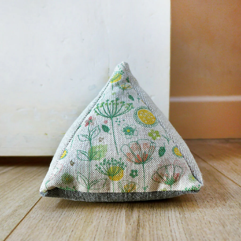 A wildflower Meadow linen doorstop made from Charlotte's floral printed fabric and natural linen.