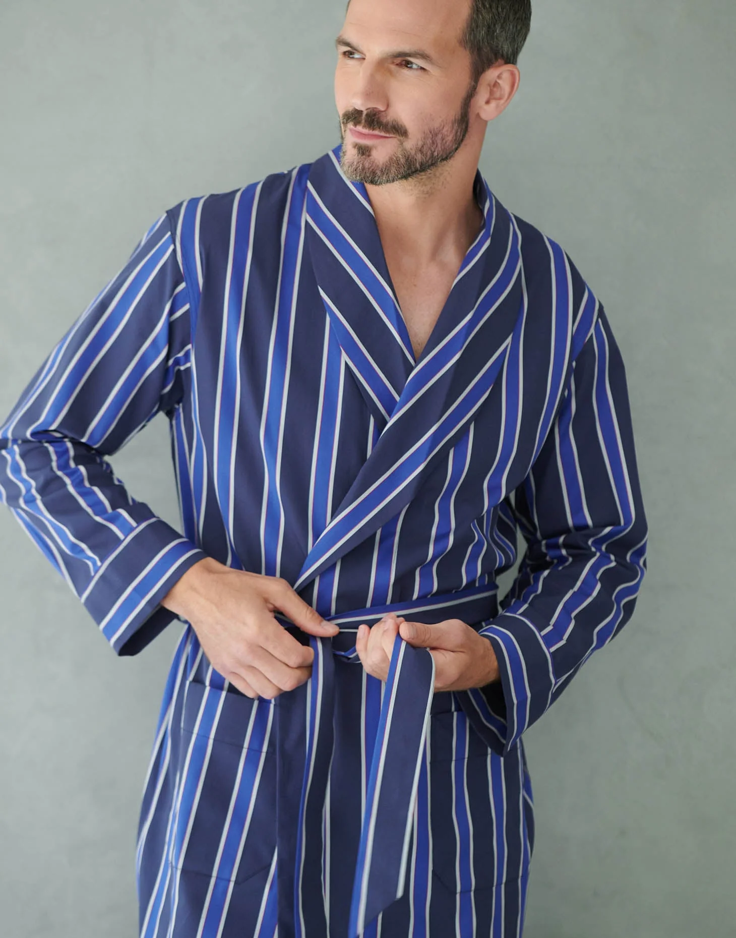 When only the best will do… This remarkable robe is made from a satinised woven cotton for an incredibly smooth result. It’s one of the finest cloths we work with – one we also use for our private-label Jermyn Street production. Woven with a crisp stripe to create a luxurious sheen, this elegant dressing gown also features two pockets at the front, inside ties, a shawl collar and a belt tie – a must-own for the discerning gent.