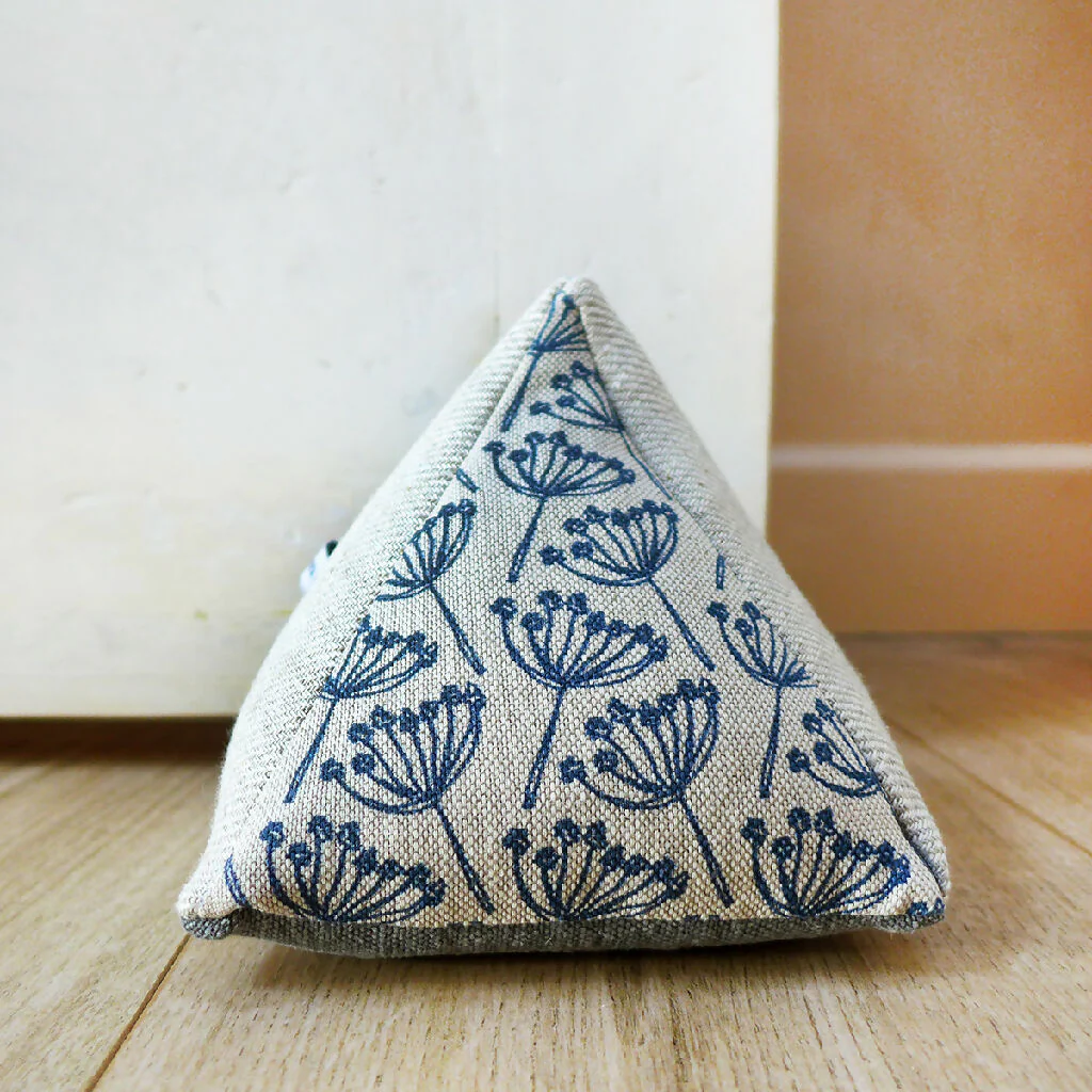 A floral Cow Parsley linen doorstop made from Charlotte's classic navy print fabric and natural linen.