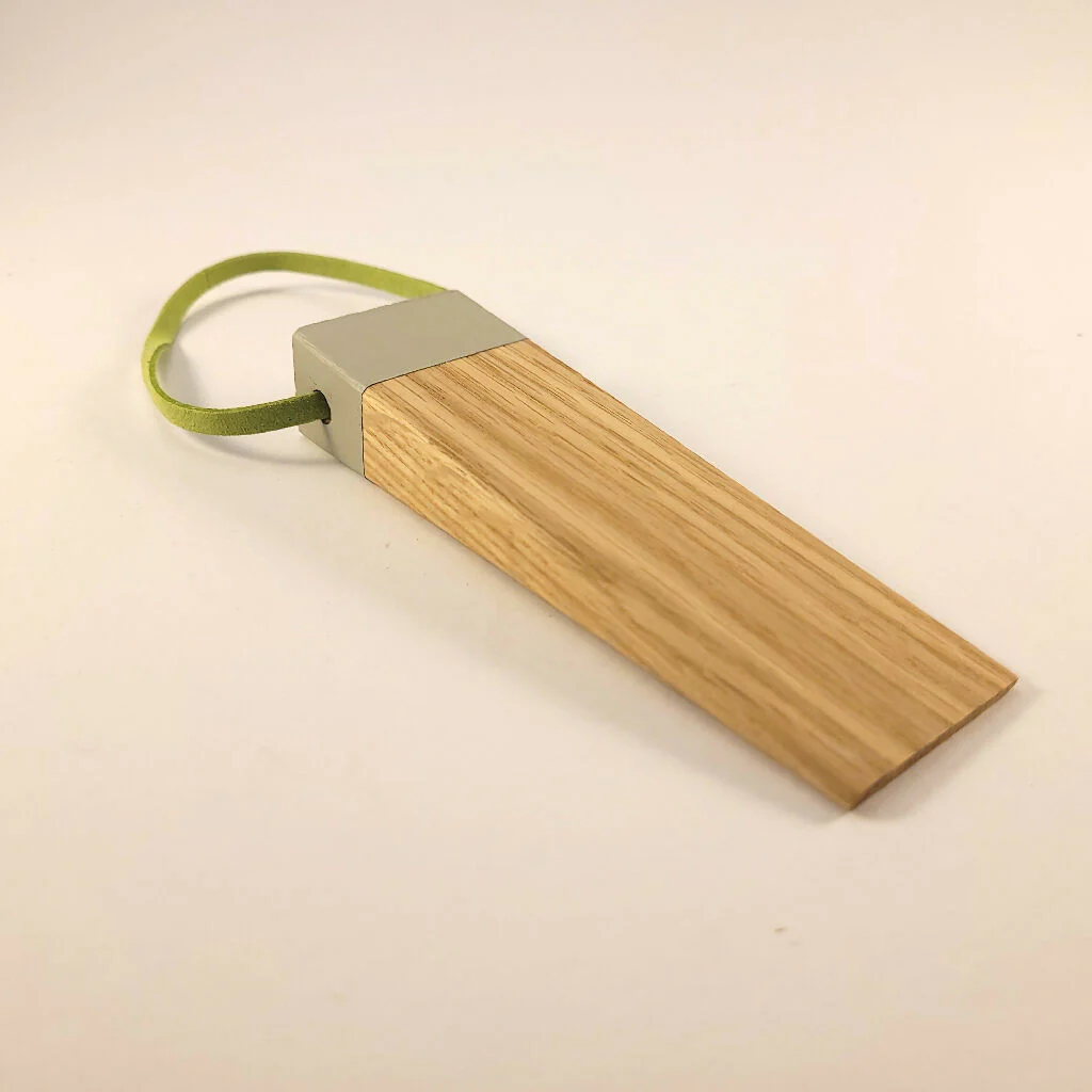 Handcrafted and painted oak door wedge made from prime grade oak. Select a coloured leather cord to compliment your wedge.  The wedge is hand painted using Frenchic paint and adds a contemporary look to a traditional piece of furniture. Finished with a couple of coats of Osmo top oil to add a protective coat and depth of colour. These door wedges will add style to your doorways.