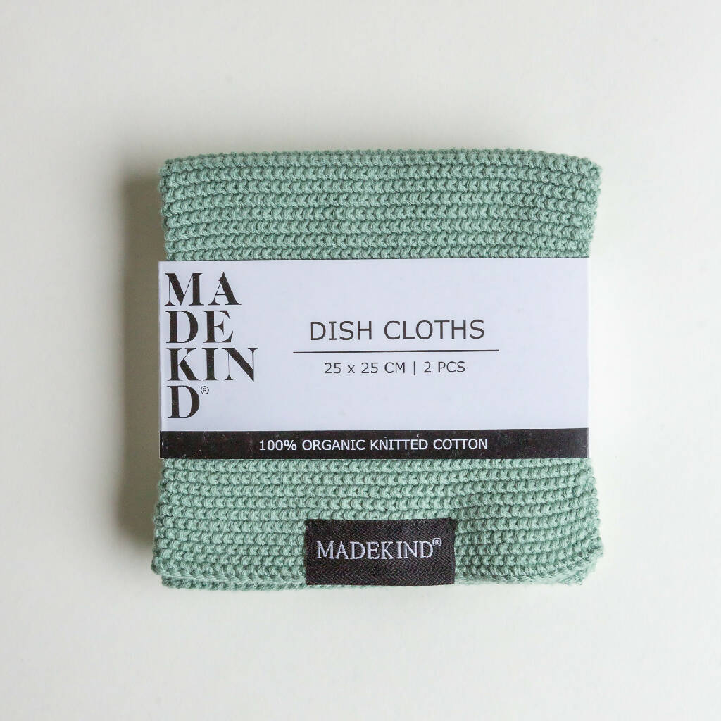 Set of 2 knitted dishcloths made from 100% organic cotton. These high quality cloths are made to last, they are machine washable and very versatile so can be used to wipe any surface.