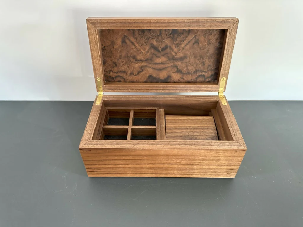 The single Watch box is a beautiful way to store your prized watch and cuff links, rings etc. keeping everything secure and in one place. The box is mitered together with decorative splines on each corner in a contrasting timber. The box top is book matched black walnut to create a unique decorative pattern.