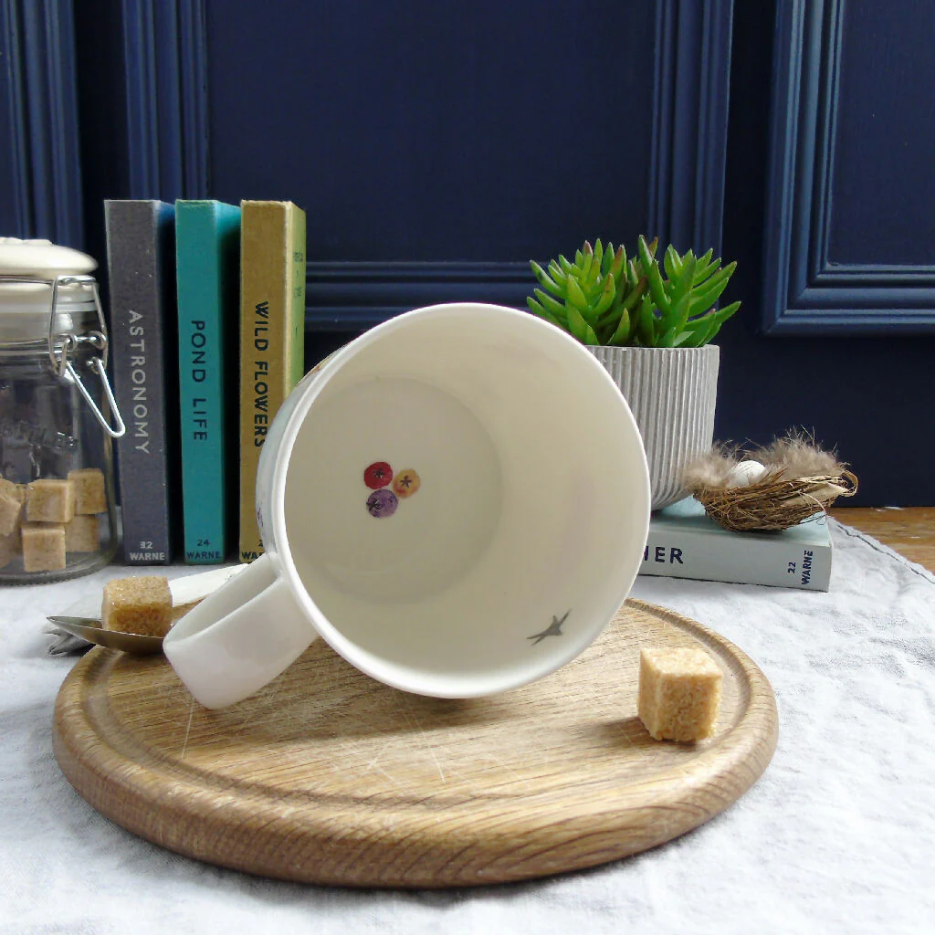 My watercolour paintings of a sleepy tawny owl and winter berries have been professionally printed onto ceramic transfers, which are then cut and applied by hand to a delicate bone china mug to create the finished design. Every mug is hand-decorated by me in this way to allow for the intricate design and detail inside the mug. This is what makes Littlebirdy Designs products unique and means every item has been closely handled with diligent care and attention.
