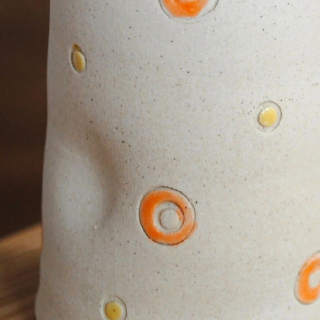 A stoneware hand thrown jug, vase with added dimples. The original way to serve milk, cream and sauces or to display a small bunch of flowers.