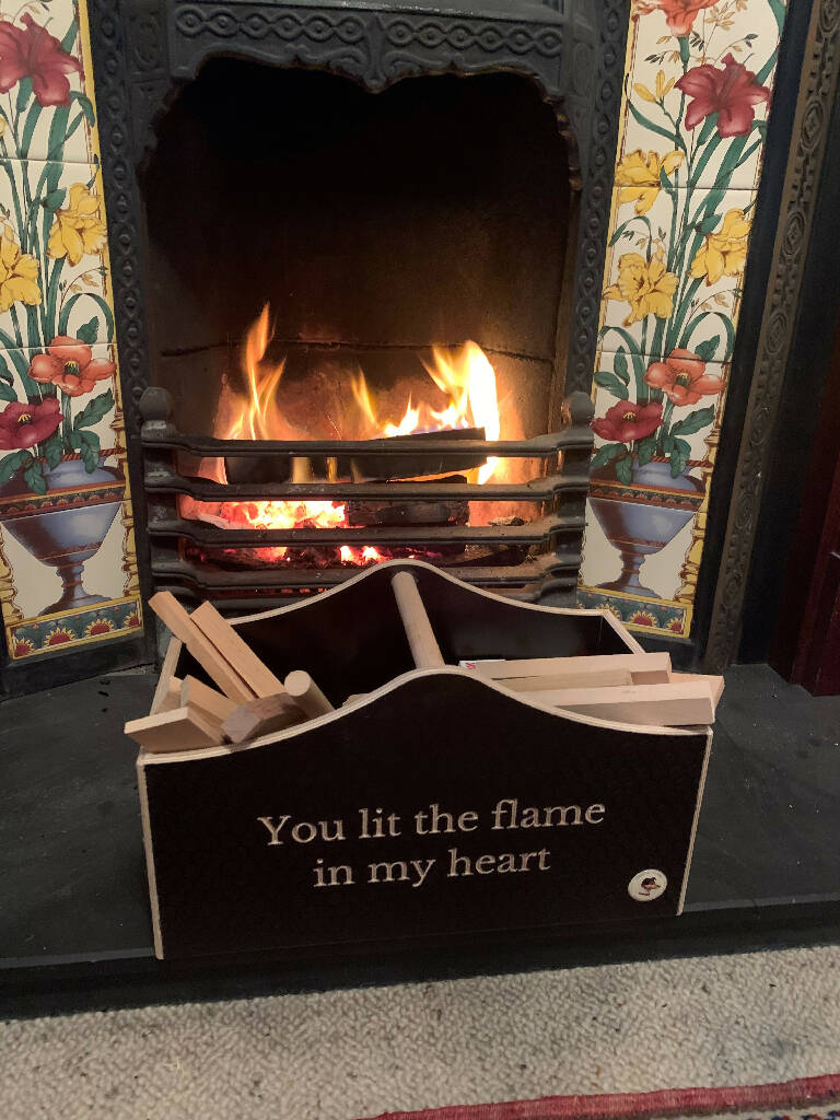 Our Beautiful Kindling box will look fantastic next to any fireplace, made from a unique wood that looks stunning when engraved, we have 2 standard engravings – 'Kindling' & 'You Lit the flame in my heart', you can also personalise this product to make it really unique.